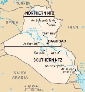 OPC took place in an area of northern Iraq above the 36th parallel. This area, approximately 160 by 70 kilometers (99 by 43 mi) in size, was designated a "no-fly" security zone by UN coalition forces, enforced by a combined task force (CTF) of daily armed aircraft patrols from participating nations, including the United Kingdom, France, Turkey, and the United States. The United States Army was tasked with assisting civilian relief agencies to build communities and facilities for the Kurds in Northern Iraq. Over the next three years, 27,000 fixed-wing and 1,400 helicopter coalition flights took place in the zone to support humanitarian operations without interference from Iraqi aircraft or other military units.[4][1][3]