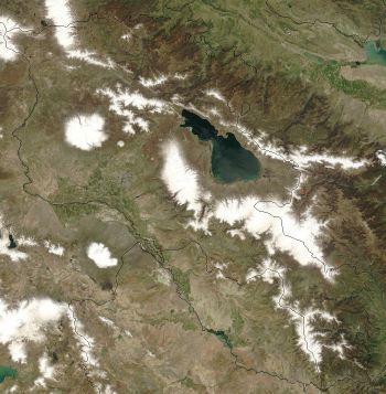 Lake Sevan nestled up in the Armenian highlands, 45 miles (72.5km) across at its widest point and 233 miles (376km) long is the second largest lake in the world relative to its altitude, 6233 feet (1900 meters) above sea level.