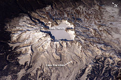 | Snow-covered view of Heaven Lake, at the top of Baekdu Mountain | |