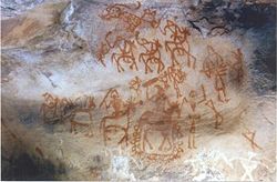The Bhimbetka shelters exhibit the earliest traces of human life in India; a number of analyses suggest that at least some of these shelters were inhabited by man for in excess of 100,000 years.[2][3] Some of the Stone Age rock paintings found among the Bhimbetka rock shelters are approximately 30,000 years old.[4]