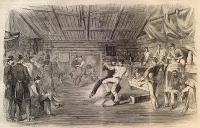 "THE STAG DANCE. OUR soldiers believe in the literal interpretation of the dictum of the Wise Man that "there is a time to dance." But to put their faith into works is not the easiest thing in the world, owing to the lack of partners of the feminine persuasion. However, by imagining a bearded and pantalooned fellow to be of "t'other kind," they succeed in getting up what they call a "Stag Dance," which is better than none, as is shown by the intense interest evinced by the spectators."