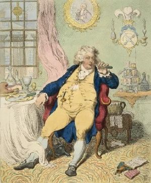 George IV was described as the "First Gentleman of England" on account of his style and manners.[61] Certainly, he possessed many good qualities; he was bright, clever and knowledgeable, but his laziness and gluttony led him to squander much of his talent. As The Times once wrote, he would always prefer "a girl and a bottle to politics and a sermon."[62]