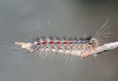 Older larvae can be identified by the presence of five pairs of raised blue spots followed by six pairs of raised brick-red spots along their backs, and a sprinkling of setae.