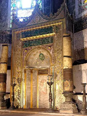 Upon its conversion, the bells, altar, iconostasis, ambo, and baptistery were removed, while iconography, such as the mosaic depictions of Jesus, Mary, Christian saints, and angels were removed or plastered over.[2] Islamic architectural additions included four minarets, a minbar and a mihrab. The Byzantine architecture of the Hagia Sophia served as inspiration for many other religious buildings including the Hagia Sophia in Thessaloniki, Panagia Ekatontapiliani, the Şehzade Mosque, the Süleymaniye Mosque, the Rüstem Pasha Mosque, and the Kılıç Ali Pasha Complex.