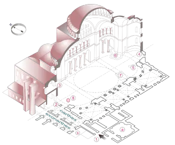 The building was accompanied by a baptistery and a skeuophylakion. A hypogeum, perhaps with an martyrium above it, was discovered before 1946, and the remnants of a brick wall with traces of marble revetment were identified in 2004.[4] The hypogeum was a tomb which may have been part of the fourth-century church or may have been from the pre-Constantinian city of Byzantium. The skeuophylakion is said by Palladius to have had a circular floor plan, and since some U-shaped basilicas in Rome were funerary churches with attached circular mausolea (the Mausoleum of Constantina and the Mausoleum of Helena), it is possible it originally had a funerary function, though by 405 its use had changed.[4]