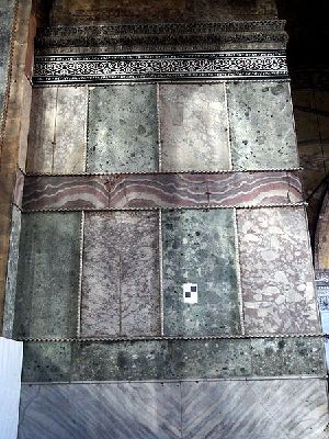 Originally the exterior of the church was covered with marble veneer, as indicated by remaining pieces of marble and surviving attachments for lost panels on the building's western face. The white marble cladding of much of the church, together with gilding of some parts, would have given Hagia Sophia a shimmering appearance quite different from the brick- and plaster-work of the modern period, and would have significantly increased its visibility from the sea.[4] The cathedral's interior surfaces were sheathed with polychrome marbles, green and white with purple porphyry, and gold mosaics. The exterior was clad in stucco that was tinted yellow and red during the nineteenth-century restorations by the Fossati architects.[12]