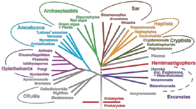 On this basis, the diagram below (redrawn from their article) showed the real "kingdoms" (their quotation marks) of the eukaryotes (Simpson and Roger 2004). A classification which followed this approach was produced in 2005 for the International Society of Protistologists, by a committee which "worked in collaboration with specialists from many societies." It divided the eukaryotes into the same six "supergroups" (Adl et al. 2005). The published classification deliberately did not use formal taxonomic ranks, including that of "kingdom."