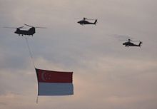 | English: Onward Singapore A giant Singapore flag suspended from a CH-47 Chinook helicopter during a National Day Parade rehearsal on July 29, 2006. The flyover occurred when "Majulah Singapura" was being played. | |