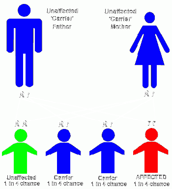 - Autosomal recessive inheritance occurs when both parents carry and pass on a copy of the faulty gene, but neither parent is affected by the disorder. Each child born to these parents has a 25 percent chance of inheriting both copies of the defective gene, a 50 percent chance of being a carrier, and a 25 percent chance of not inheriting either copy of the defective gene. Children of either gender can be affected by an autosomal recessive pattern of inheritance.