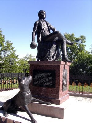 Numerous statues and memorials dot the cities, towns, and countryside of Germany, including the famous Bismarck Memorial in Berlin. The only memorial showing him as a student at Göttingen University (together with his dog Ariel) and as a member of his Corps Hannovera was re-erected in 2006 at the Rudelsburg.