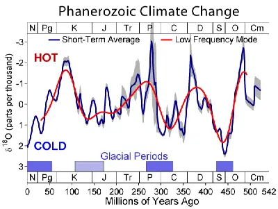 Superimposed on the long-term evolution between hot and cold climates have been many short-term fluctuations in climate similar to, and sometimes more severe than, the varying glacial and interglacial states of the present ice age. Some of the most severe fluctuations, such as the Paleocene-Eocene Thermal Maximum, may be related to rapid increases in atmospheric carbon dioxide due to the collapse of natural methane reservoirs in the oceans. Severe climate changes also seem to have occurred during the course of the Cretaceous-Tertiary, Permian-Triassic, and Ordovician-Silurian extinction events; however, it is unclear to what degree these changes caused the extinctions rather than merely responding to other processes that may have been more directly responsible for the extinctions.