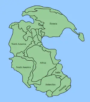 During the Permian, all of Earth's major land masses, except portions of East Asia, were collected into a single supercontinent known as Pangaea (or Pangea). Pangaea would break apart during the Triassic and Jurassic periods of the Mesozoic, separating into Laurasia and Gondwana (or Gondwanaland).