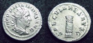 Little is known about Philip's early life and political career. He was born in Shahba, about 55 miles southeast of Damascus, in the of Syria. Philip has the nickname "the Arab" because he had family who had originated in the Arabian peninsula, believed to be distant descendants of the Baleed family of Aleppo. Philip was the son of a Julius Marinus, a local Roman citizen, possibly of some importance. Many historians agree that he was of Arab descent who gained Roman citizenship through his father, a man of considerable influence. Ball refers to a story that Philip's father was a bandit, which he attributes to "later Roman anti-Arab prejudice."[1] Many citizens from the provinces took Roman names upon acquiring citizenship. This makes tracing his Arabic blood line difficult. However, it is documented that Rome used the Ghassan tribe from the Azd of Yemen as vassals to keep the neighboring northern Arabs in check. Arabic oracles speak of a local Sheikh, Uthaina, who was reported to have risen from the ranks to command the Eastern armies of the Roman Empire. This strengthens the possibility of Philip's Arab descent to some degree. Zahran describes Philip as an educated and "cultivated man" who admired Greek learning and was probably influenced by the Sophists."[2]
