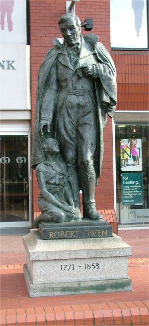 Robert Owen (May 14, 1771, Newtown, Powys â November 17, 1858) was a Welsh utopian socialist and social reformer, whose attempts to reconstruct society widely influenced social experimentation and the cooperative movement. The innovative social and industrial reforms which he introduced at his New Lanark Mills during the early 1800s made it a place of pilgrimage for social reformers and statesmen from all over Europe. He advocated the elimination of poverty through the establishment of self-sustaining communities, and experimented with such a utopian community himself at New Harmony, Indiana, from 1825 to 1828.