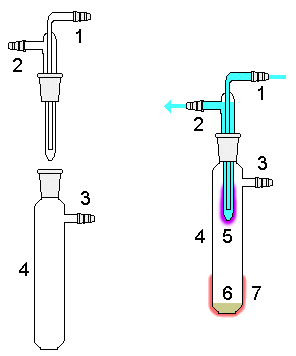 Sublimation is a technique used by chemists to purify compounds. Typically a solid is placed in a vessel which is then heated under vacuum. Under this reduced pressure the solid volatilizes and condenses as a purified compound on a cooled surface, leaving the non-volatile impurities behind. This cooled surface often takes the form of a "cold finger" (shown in the diagram above). Once heating ceases and the vacuum is released, the sublimed compound can be collected from the cooled surface. Usually this is done using a sublimation apparatus.