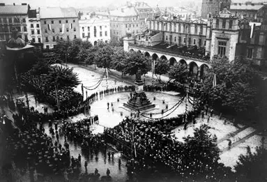 In the late 1840s Słowacki attached himself to a group of like-minded young exiles, determined to return to Poland and win its independence.[9] One of his friends was the pianist and composer Frédéric Chopin. Others included enthusiasts of his work, such as Zygmunt Szczęsny Feliński, Józef Alojzy Reitzenheim and Józef Komierowski. Despite poor health, when he heard about the events of the Spring of Nations, Słowacki traveled with some friends to Poznań, then under Prussian control, hoping to participate in the Wielkopolska Uprising of 1848. He addressed the National Committee (Komitet Narodowy) in Poznań on April 27.[1] "I tell you", he declared as the rebels faced military confrontation with the Prussian Army, "that the new age has dawned, the age of holy anarchy." But by May 9, the revolt was crushed.[15]