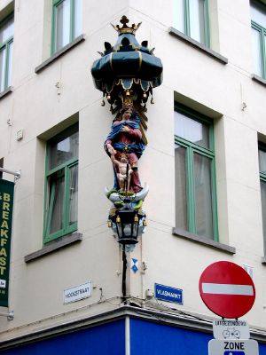 The name Antwerpen, in Dutch, means roughly "to throw a hand." According to folklore, a mythical giant called Antigoon exacted a toll from those crossing the river. Any who refused to pay would have a hand cut off and thrown into the River Scheldt. Eventually, a young hero named Brabo killed the giant, cut off the giant's hand, and flung it into the river. Another theory is that the name comes from the Latin antverpia, indicating land that forms by deposition in the inside curve of a river. Yet another theory is that the name derives from "anda" (at) and "werpum" (wharf).