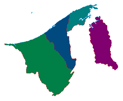 Brunei is divided into four districts (daerah): Belait, Brunei and Muara, Temburong, and Tutong. The districts are subdivided into 38 mukims.