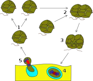 In most dinoflagellates, the nucleus is dinokaryotic throughout the entire life cycle. They are usually haploid, and reproduce primarily through fission, but sexual reproduction also occurs. This takes place by fusion of two individuals to form a zygote, which may remain mobile in typical dinoflagellate fashion or may form a resting dinocyst, which later undergoes meiosis to produce new haploid cells.