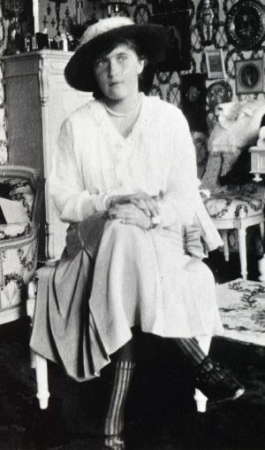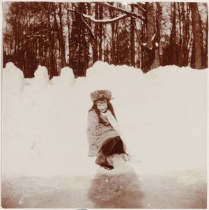 Anastasia's daring occasionally exceeded the limits of acceptable behavior. "She undoubtedly held the record for punishable deeds in her family, for in naughtiness she was a true genius," said Gleb Botkin, son of the court physician Yevgeny Botkin, who later died with the family at Ekaterinburg.[10] Anastasia sometimes tripped the servants and played pranks on her tutors. As a child, she would climb trees and refuse to come down. Once, during a snowball fight at the family's Polish estate, Anastasia rolled a rock into a snowball and threw it at her older sister Tatiana, knocking her to the ground.[6] A distant cousin, Princess Nina Georgievna, recalled that "Anastasia was nasty to the point of being evil," and would cheat, kick and scratch her playmates during games; she was affronted because the younger Nina was taller than she was.[11] She was also less concerned about her appearance than her sisters. Hallie Erminie Rives, a best-selling American author and wife of an American diplomat, described how ten-year-old Anastasia ate chocolates without bothering to remove her long, white opera gloves at the Saint Petersburg opera house.[12]