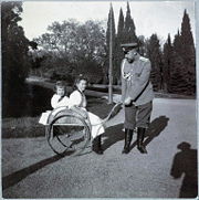 Despite her energy, Anastasia's physical health was sometimes poor. The Grand Duchess suffered from the painful condition hallux valgus (bunions), which affected both of her big toes.[14] Anastasia had a weak muscle in her back and was prescribed twice-weekly massage. She hid under the bed or in a cupboard to put off the massage.[15] Anastasia's older sister, Maria, reportedly hemorrhaged in December 1914 during an operation to remove her tonsils, according to her paternal aunt Grand Duchess Olga Alexandrovna of Russia, who was interviewed later in her life. The doctor performing the operation was so unnerved that he had to be ordered to continue by Maria's mother, Tsarina Alexandra. Olga Alexandrovna said she believed all four of her nieces bled more than was normal and believed they were carriers of the hemophilia gene, like their mother.[16] Symptomatic carriers of the gene, while not hemophiliacs themselves, can have symptoms of hemophilia including a lower than normal blood clotting factor that can lead to heavy bleeding.[17] Anastasia, like all her family, doted on the long-awaited heir, Tsarevich Alexei, or "Baby," who suffered frequent attacks of hemophilia and nearly died several times.
