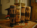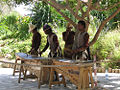 There are three main forms of tuned xylophones and marimbas found in Africa: (1) wooden slabs arranged in a graduated scale are mounted over a resonance box (a pit, a clay pot or an open trough may be used). Iboland in Nigeria and the Zaramo of Tanzania make xylophones of this type. (2) In the Kissi country in Guinea and in the Ivory Coast, xylophones are made by laying keys over two pieces of banana stems. (3) Gourd resonators are used to resonate keys placed above the open gourd and mounted in a wooden frame. These gourd resonating xylophones and marimbas are found in west, central and east Africa. Xylophones and marimbas may be played by themselves or in combination with other instruments. It is common among the Vatapa (Shona) of Zimbabwe to hear large ensembles involving as many as ten to fifteen players performing in large xylophone ensembles consisting of xylophones ranging in size from small (those that are strapped over the back and carried) to large (those that are large enough to have the player stand on a riser to reach).