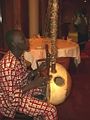 The kora, a multiple resonator bow, is one of the most important musical instruments in West Africa, usually played by the griot, or village historian. The kora is made from a natural calabash cut in half and partially covered with cow skin, with a hardwood post running through it. Between twenty and twenty-five strings run the length of the instrument, passing over a bridge that rests on the stretched skin cover.