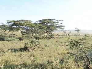 The park's predominant environment is open grass plain with scattered Acacia bushes. The western uplands of the park have highland dry forest with stands of Olea africana, Croton dichogamus, Brachylaena hutchinsii, and Calodendrum. The lower slopes of these areas are grassland. Themeda, Cypress, Digitaria, and Cynodon species are found in these grassland areas. There are also scattered yellow-barked Acacia xanthophloea. There is a riverine forest along the permanent river in the south of the park. There are areas of broken bush and deep rocky valleys and gorges within the park. The species in the valleys are predominantly Acacia and Euphorbia candelabrum. Other tree species include Apodytes dimidiata, Canthium schimperiana, Elaeodendron buchananii, Ficus eriocarpa, Aspilia mossambicensis, Rhus natalensis, and Newtonia species. Several plants that grow on the rocky hillsides are unique to the Nairobi area. These species include Euphorbia brevitorta, Drimia calcarata, and Murdannia clarkeana.[4]