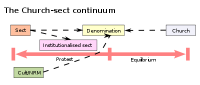 The Church-Sect Typology is one of the most common classification schemes employed in sociology for differentiating between different types of religions. This scheme has its origins in the work of Max Weber. The basic idea is that there is a continuum along which religions fall, ranging from the protest-like orientation of sects to the equilibrium maintaining churches. Along this continuum are several additional types, each of which will be discussed in turn. The term "church" does not necessarily apply to a Christian church, but is intended to signify a well-organized, centralized religion in general.