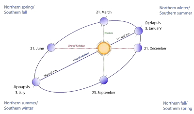 The seasons are not caused by the varying distance of Earth from the Sun due to the orbital eccentricity of the Earth's orbit. This variation does make such a contribution, but is small compared with the effects of exposure because of Earth's tilt. Currently the Earth reaches perihelion at the beginning of January, which is during the northern winter and the southern summer. The Sun, being closer to Earth and therefore hotter, does not cause the whole planet to enter summer. Although it is true that the northern winter is somewhat warmer than the southern winter, the placement of the continents, ice-covered Antarctica in particular, may also play an important factor. In the same way, during aphelion at the beginning of July, the Sun is farther away, but that still leaves the northern summer and southern winter as they are with only minor effects.