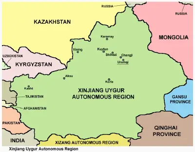 | Xinjiang Uygur Autonomous Region Uyghur: شىنجاڭ ئۇيغۇر ئاپتونوم رايونى (Xinjang Uyghur Aptonom Rayoni) Chinese:新疆维吾尔自治区 (Xīnjiāng Wéiwú'ěr Zìzhìqū) | |